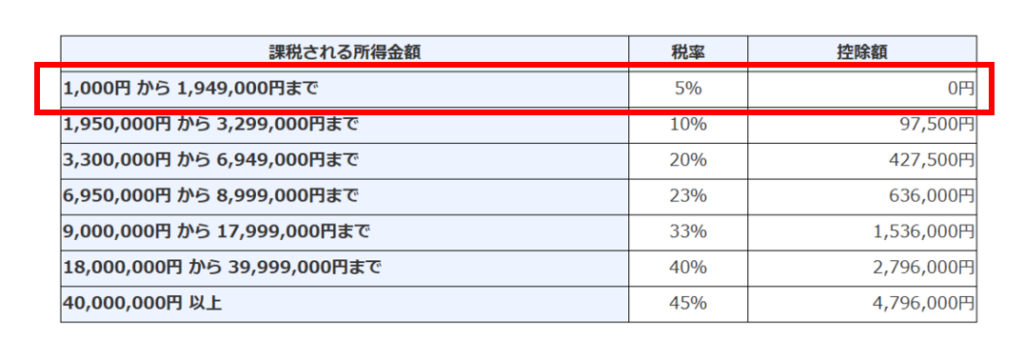 そしてこちらは、所得税の速算表です。これを見ると、課税所得690,000円にかかる税率は5%となります。つまり、源泉徴収票にあるように、津田様が令和7年度に支払った所得税は34,500円ということです。