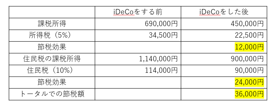 では、iDeCoで老後のための積立を毎月2万円、年間24万円するとどうなるでしょうか?掛金は全額所得控除ですから、課税所得が690,000円から450,000円に下がります。結果、支払うべき所得税は22,500円となり節税額は12,000円と分ります。