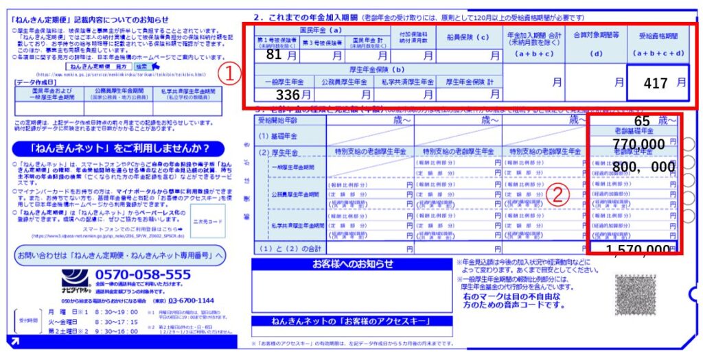 ①の欄には、津田様のこれまでの年金加入歴が記載されています。学生時代と介護離職をしてから昨年までは第1号被保険者、それ以外の期間は第2号被保険者、つまり会社員であったことが分ります。ねんきん定期便発行時点までの受給資格期間は417ヶ月ですから、老齢給付を受ける権利である120ヶ月はすでに取得しています。