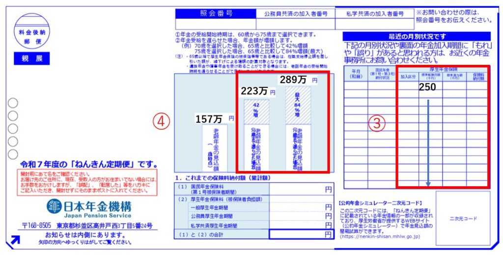 ③が現在の年金加入状況です。標準報酬月額は給与ですから、現在25万円の給与で厚生年金に加入していることが分ります。このまま給与が60歳まで変らないという前提で年金見込み額は計算されています。