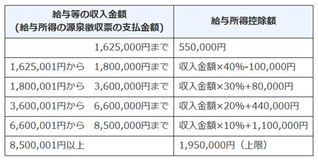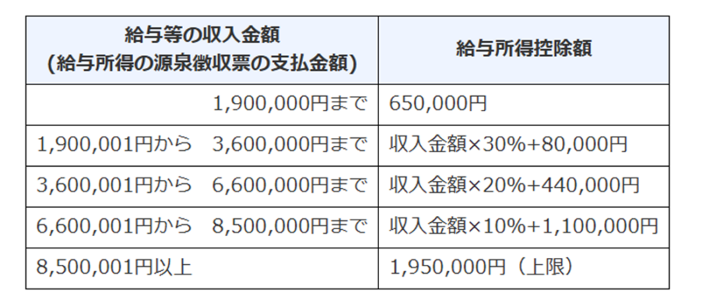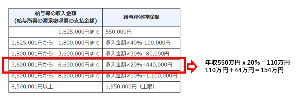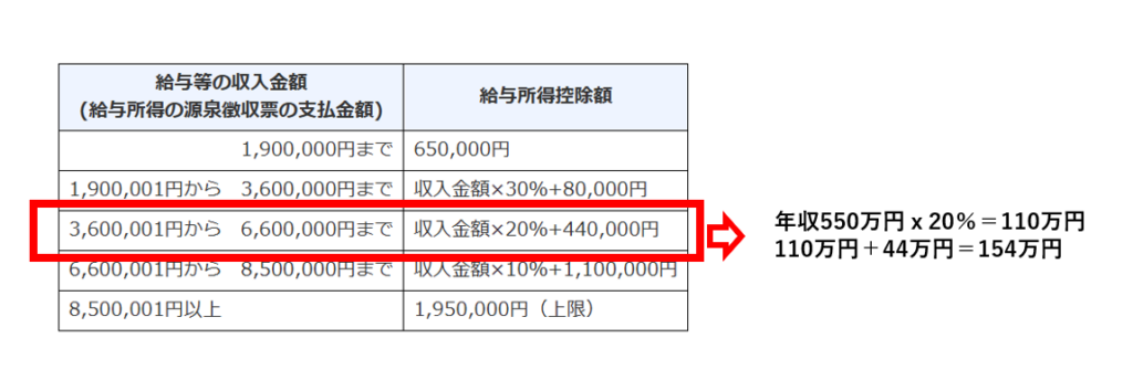 給与所得控除は以下の表に当てはめて計算します。中田様の給与所得控除額は154万円、従って②の控除後の金額は5,500,000円-1,540,000円=3,960,0000円となります。