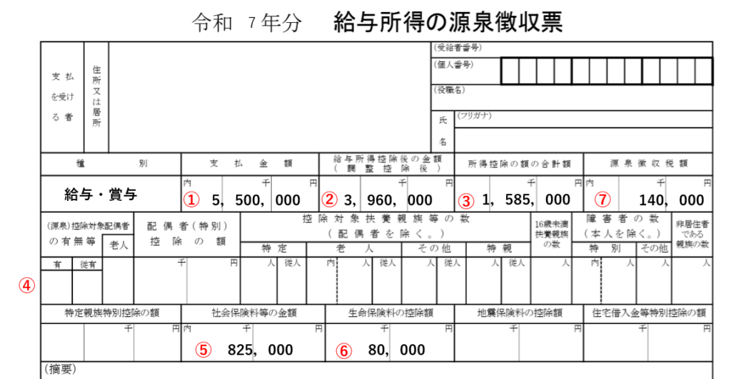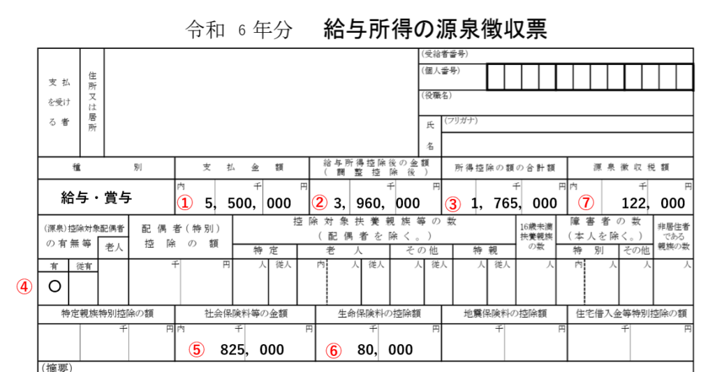 ① 支払金額 これは、いわゆる年収です。1年間の給与と賞与が合算されています。ちなみに月15万円までの交通費は課税の対象とはなりません。