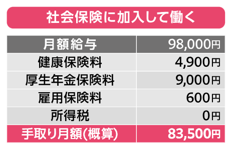 ご覧のように、月額給与が98,000円で同じであっても、社会保険に加入することによって手取りが13,400円も減額してしまいます。年間にすると160,800円減と見過ごせない金額です。