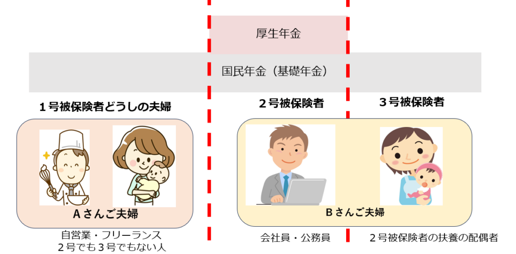一方Bさんご夫婦は、ご主人が会社員で奥さんはパートの主婦です。ちょうど山根さんと同じ環境です。被保険者区分「2号」のご主人は、お給料の金額に応じた保険料を負担します。一方扶養の奥さんは、「3号」で健康保険も国民年金も保険料を負担がいらない免除となります。