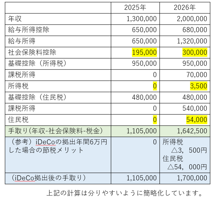 2025年は年収130万円、2026年は年収200万円とした比較表です。
