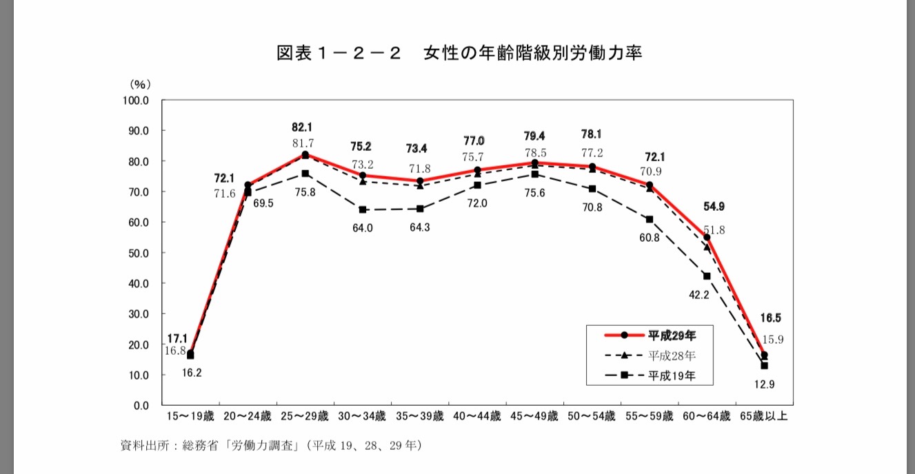 女性の労働力率を年齢階級別にグラフを見ると結婚、出産、育児で退職する年齢階級(30歳~39歳)に労働力が落ち込む、M字カーブが近年解消されつつ、台形に近づいてきています。「結婚=退職」「寿退社」という考え方が改められつつあり、結婚しても、出産しても仕事を続けられる社会整備が続けられています。