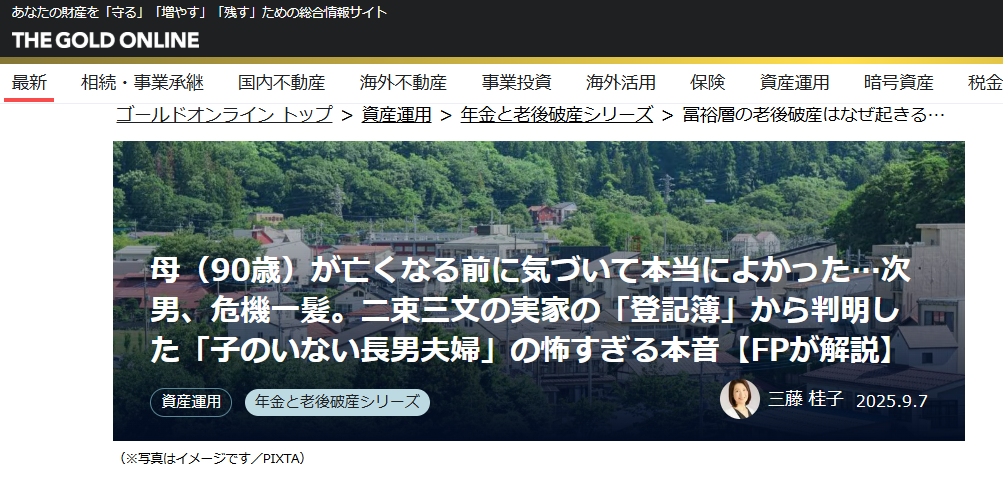 母(90歳)が亡くなる前に気づいて本当によかった…次男、危機一髪。二束三文の実家の「登記簿」から判明した「子のいない長男夫婦」の怖すぎる本音【FPが解説】について、ご興味がございましたらご一読いただけると幸いです。