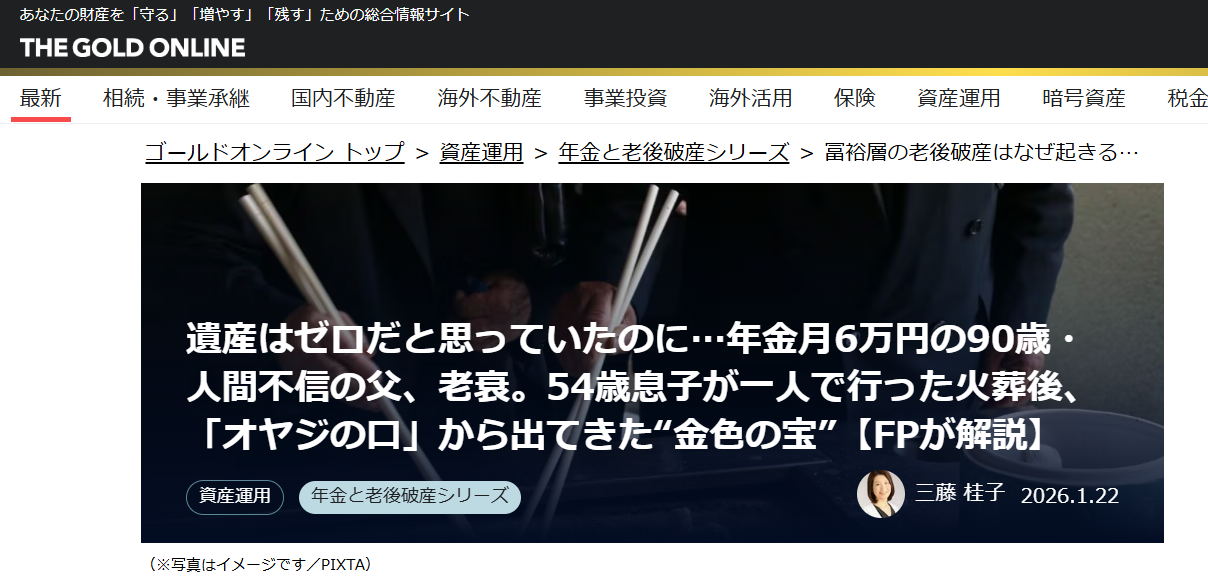 遺産はゼロだと思っていたのに…年金月6万円の90歳・人間不信の父、老衰。54歳息子が一人で行った火葬後、「オヤジの口」から出てきた“金色の宝”【FPが解説】について、ご興味がございましたらご一読いただけると幸いです。