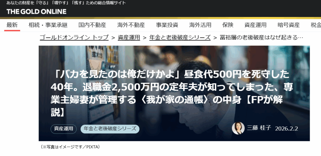 「バカを見たのは俺だけかよ」昼食代500円を死守した40年。退職金2,500万円の定年夫が知ってしまった、専業主婦妻が管理する〈我が家の通帳〉の中身【FPが解説】について、ご興味がございましたらご一読いただけると幸いです。