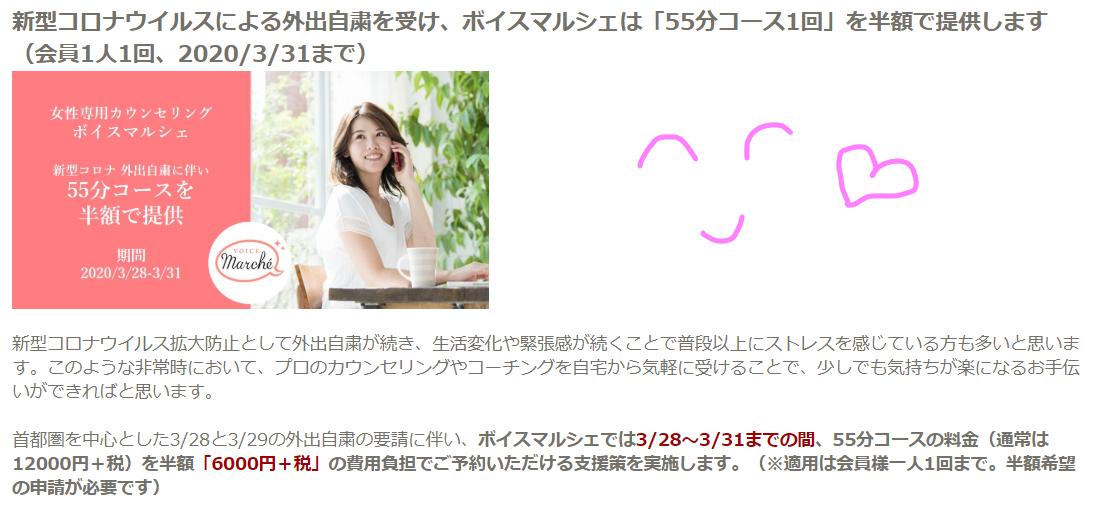 女性専用の電話カウンセリング『ボイスマルシェ』からお知らせです。