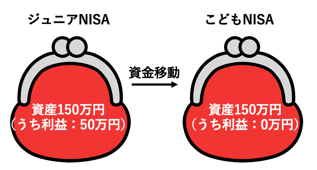 たとえば、ジュニアNISAで100万円が150万円になって50万円の利益が出ていたとしても、こどもNISAに移すと、資金は150万円、見た目は損益率±ゼロからのスタートになります。