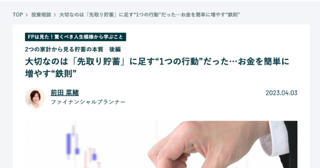 FP FP相談 iDeCo NISA SBI証券 つみたてNISA イオン銀行 セミナー ファイナンシャルフィールド執筆実績 ファイナンシャルプランナー フィナシー執筆実績 マイナビ執筆実績 マイホーム メディア実績 ライフプラン ロボアド ロボアド研究会 企業型確定拠出年金 住宅ローン 保険見直し 働くママ 児童手当 初心者 前田菜緒 執筆実績 奨学金 子育て 子育てとお金研究会 家計 年末調整 年金 所得控除 投資信託 投資初心者 教育費 東洋経済オンライン執筆実績 楽ラップ 男性育休 節税 節約 老後資金 育休 貯蓄 資産運用 転職 運営管理機関 運用初心者 離婚 高校授業料無償化 THEO