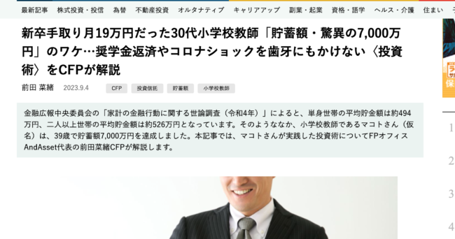 FP FP相談 iDeCo NISA SBI証券 つみたてNISA イオン銀行 セミナー ファイナンシャルフィールド執筆実績 ファイナンシャルプランナー フィナシー執筆実績 マイナビ執筆実績 マイホーム メディア実績 ライフプラン ロボアド ロボアド研究会 企業型確定拠出年金 住宅ローン 保険見直し 働くママ 児童手当 初心者 前田菜緒 執筆実績 奨学金 子育て 子育てとお金研究会 家計 年末調整 年金 所得控除 投資信託 投資初心者 教育費 東洋経済オンライン執筆実績 楽ラップ 男性育休 節税 節約 老後資金 育休 貯蓄 資産運用 転職 運営管理機関 運用初心者 離婚 高校授業料無償化 THEO