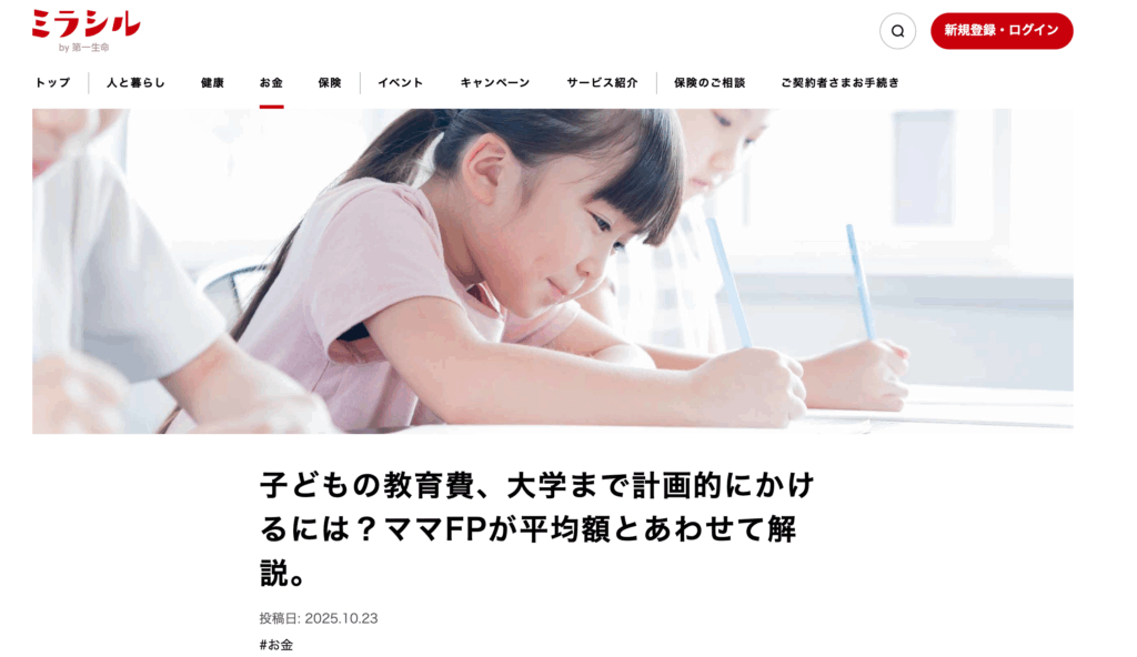 メディア関連 2025年10月25日前田 菜緒 【メディア実績】「ミラシルby第一生命」さんで取材協力させていただきました HOMEメディア関連【メディア実績】「ミラシルby第一生命」さんで取材協力させていただきました こんにちは 子育て世代の家計のパートナー、FP相談ねっと認定FPの前田です。 「ミラシルby第一生命」さんで教育費に関する取材協力させていただきました。 取材・執筆のご依頼・お問合せ 𝕏 コピーしました FP チャレンジタッチ ファイナンシャルプランナー メディア実績 子育て 家計 教育費 前の記事へ 関連記事 【メデイア実績】SBI証券「知っとくおかねコミュニティ」貯蓄と投資、家計からのバランスはどうしたらいい? こんにちは。 子育て世代の家計のパートナー、FP相談ねっと認定FPの前田です。 SBI証券さんのコミュニティサイト「知っトクおかねコミュニティ」でコラムが掲載されました。 貯蓄と投資、家計からのバランスはどうしたらいい? つみたてNISAをはじめたいけれど、いくら積み立てればよいかという質問をたくさん受けます。 まずは…… 【メディア実績】2025年8月号チャレンジタッチ3年生取材協力 こんにちは 子育て世代の家計のパートナー、FP相談ねっと認定FPの前田です。 2025年8月号進研ゼミ小学講座の3年生チャレンジタッチ通信で取材協力させていただきました。 …… 【メディア実績】通信制高校ナビ「高校の学費が払えないかも… 不安なあなたにFPが紹介する支援金・給付金制度」 こんにちは。 子育て世代の家計のパートナー、FP相談ねっと認定FPの前田です。 通信制高校ナビさんで取材協力させていただきました。 https://www.tsuushinsei-navi.com/real/expert/2575/ 通信制の高校に通う人のためのサイトです。 高校生への支援制度について、お答えしました。 …… 【メディア実績】ファイナンシャルフィールド「子どもが3人いても全員が大学無償化になるわけではない!」 こんにちは 子育て世代の家計のパートナー、FP相談ねっと認定FPの前田です。 ファイナンシャルフィールドさんで記事が掲載されました。 子どもが3人いても全員が大学無償化になるわけではない! キーワードは「扶養する子の数」……子どもの大学費用を考える時の注意点とは? ……