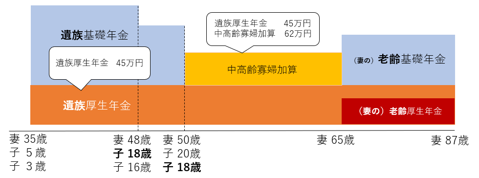 たとえば、会社員の夫が35歳の妻と5歳・3歳の子どもを残して亡くなった場合、遺族基礎年金+遺族厚生年金が支給されます。