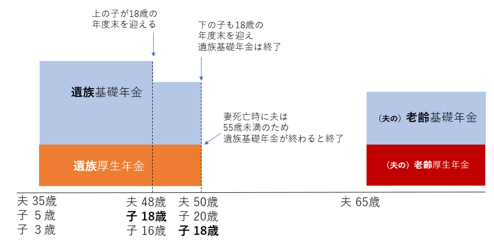 遺族基礎年金は子どもがいれば同様に支給されますが、夫が55歳未満であれば遺族厚生年金は本来受け取れません。