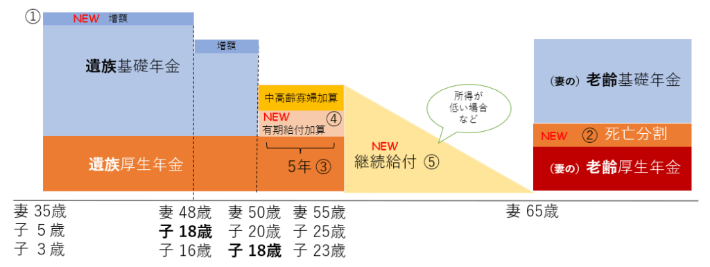 5年間の期限付きではありますが、この期間に受け取れる遺族厚生年金の金額は増額します(④の部分)