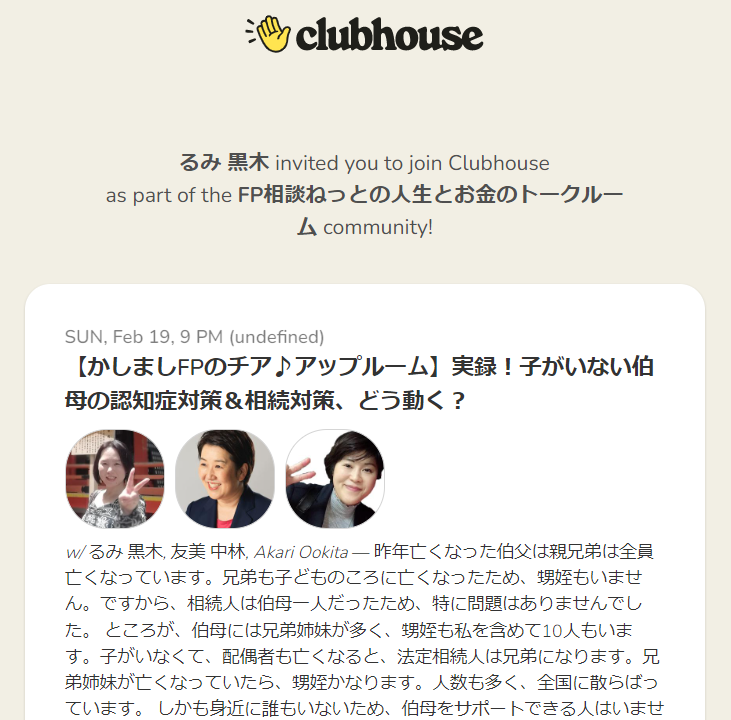 Clubhouseでは「70代の親をもつFP研究会」と連動して、