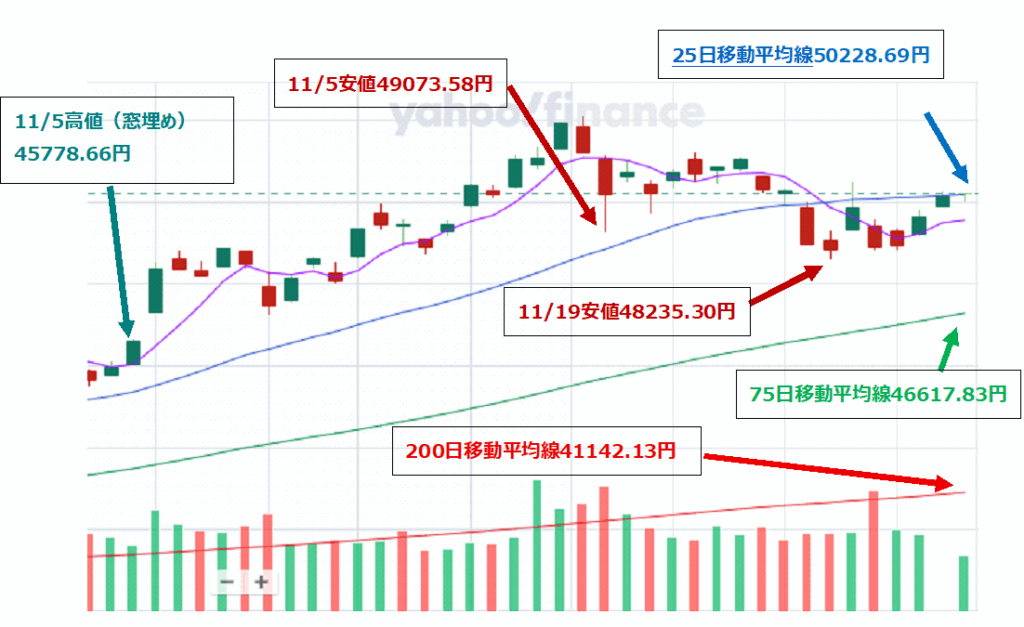 日経平均株価は、終値ベースでは10/31(金)に52411.34円、ザラ場(取引時間中)ベースでは11/4(火)に52636.87円と高値をつけ、それ以来、5万円や25日移動平均線を挟んだもみ合い、横ばい相場となっています。