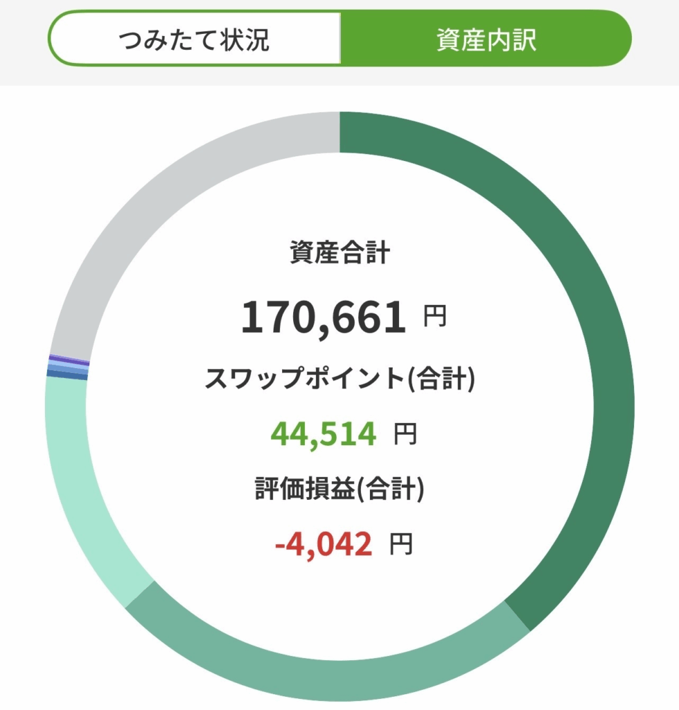| 月間キャッシュフロー ※キャピタルゲイン含まない、月間のインカムゲインのみの数字です。 (以下含む) ・スワップポイント ・分配金 ・配当金 | 6,190円 ※真の元本比+1.73%の利回り |