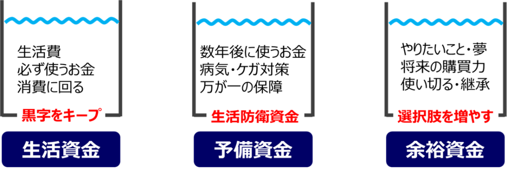 つぎに予備資金のうち、まずは健康的に働ける環境に万が一のことがあっても、いまの生活をある程度維持できるように、保険などを活用して生活保障を充実させます。