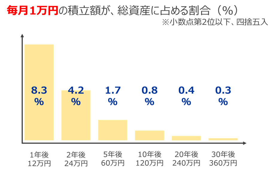 そうすると、積み立ってきた総資産に占める、毎月の積立額のインパクトが反比例して徐々に小さくなっていきます。