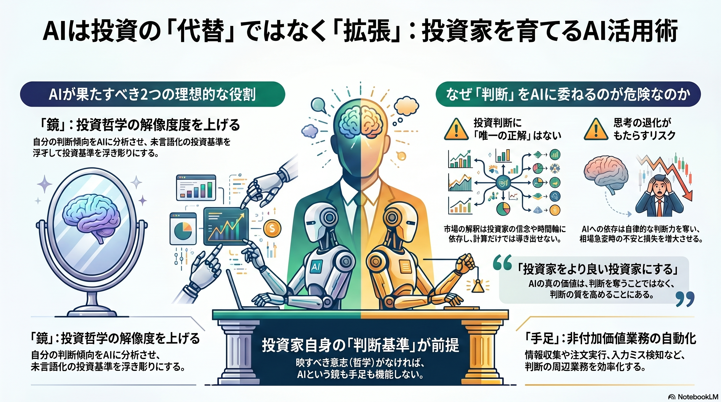 しかし、中長期投資における真の成功とは、判断をAIに代行させることではなく、AIを介して自らの「思考を深化」させるプロセスの中にこそ存在します。