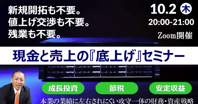 新規開拓を頑張ることも、値上げをお願いすることも、残業して頑張ることも、いっさい必要ない合法的ノウハウで、攻め(成長資産)× 守り(節税)× 安定(売上逓増)の3本柱をどう組み合わせていくとよいのか、実例を交えて解説します。