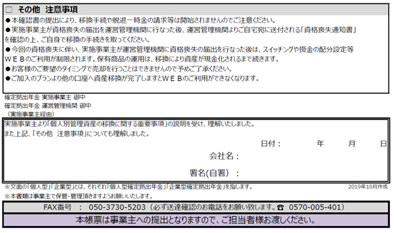 画像は、『確定拠出年金 個人別管理資産の移換に関する説明確認書』の一部分ですが、説明を受けて理解したしました。ということで署名する欄が設けられています。
