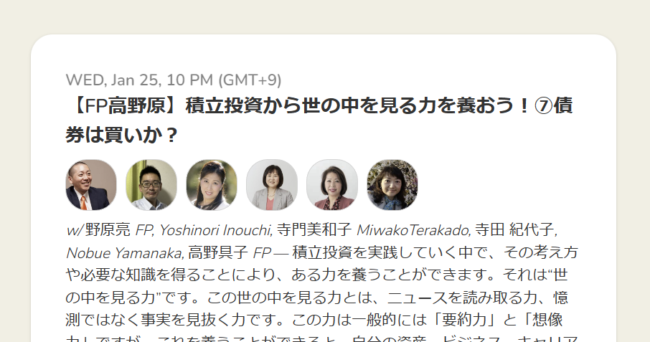 毎月第4水曜日、野原亮FPのクラブハウス「ちょっと教えて!資産運用」に聞き手としてお邪魔しています。国際金融ストラテジストの称号を持つ野原FPは資産運用のプロ中のプロです。